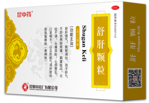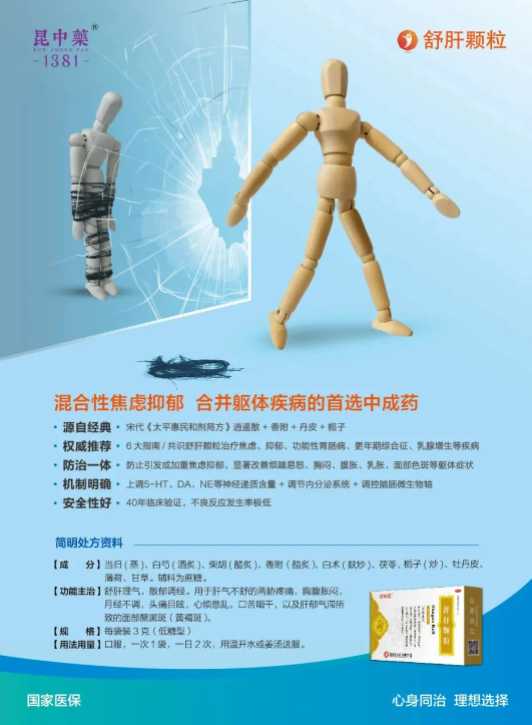舒肝颗粒作为昆中药的独家专利品种,具有舒肝理气、散郁调经的功效。其组方是在逍遥散基础上加香附、丹皮、栀子组成的,具有80年的历史传承。现代研究表明舒肝颗粒对轻至中度抑郁症,围绝经期抑郁、更年期焦虑、功能性消化不良等症状具有良好的疗效。可增加脑源性神经营养因子,5-羟色胺,去甲肾上腺素、多巴胺水平。此外,它可以减少肿瘤坏死因子- α,白细胞介素-6和高敏感性抑郁患者的蛋白质含量。