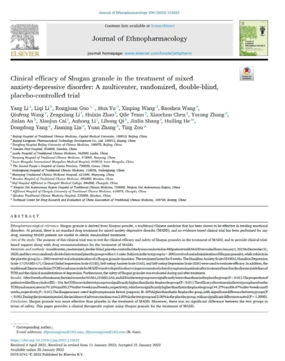 近日,郭荣娟教授团队的学术论文《Clinical efficacy of Shugan granule in the treatment of mixed anxiety-depressive disorder: A multicenter, randomized,double-blind,placebo-controlled trial(舒肝颗粒治疗MADD(肝气郁结证)的随机、双盲、安慰剂对照、多中心临床试验)》正式发表于国际学术期刊《Journal of Ethnopharmacology》(IF = 4.36)。