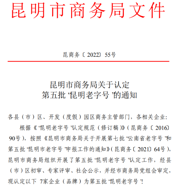 此次获得“昆明老字号”认定的企业须为云南省昆明市行政区域内的有关单位(企业或组织),拥有世代传承的产品、技艺或服务,具有鲜明的中华民族传统文化背景和深厚的文化底蕴,取得社会广泛认同,形成良好信誉的企业品牌。