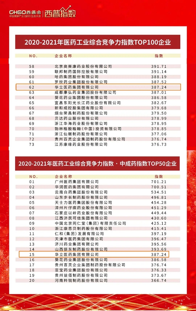 9月25日,中康科技于西普会上权威发布2020-2021年医药工业发展指数和医药工业综合竞争力指数。华立医药集团(含PP电子集团和健民集团两大上市公司)凭借实力出众的综合企业竞争力和影响力,荣登“2020-2021 年医药工业综合竞争力指数100企业”和“2020-2021年医药工业综合竞争力指数·中成药指数 50 企业”两大榜单。