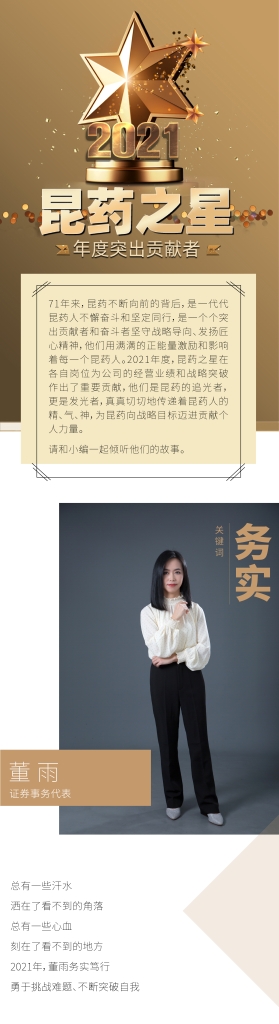 合规经营、向全体股东负责的要求,明确了风险意识应作为证券事务代表的第一素质。董雨时刻绷紧着这根弦,持续学习相关要求,更新业务知识,提升自身能力。同时,加强与领导、同事交流讨论,提升内部工作质量。“做好证代工作必须储备专业知识,积累实践经验,要不断的打磨,没有捷径。每天面对各类新规、公司各项经营举措,不断出现的新情况时刻挑战你的专业能力,如果不持续夯实专业知识,是无法有效、灵活应对的”,董雨明白,内驱力比外驱力更重要,一步一个脚印往上走,总会抵达想要到达的远方。此外,她对公司2018—2021三年公司治理情况进行排摸,梳理相关流程制度,为公司合规治理提供参考,促进公司合规治理良好生态。